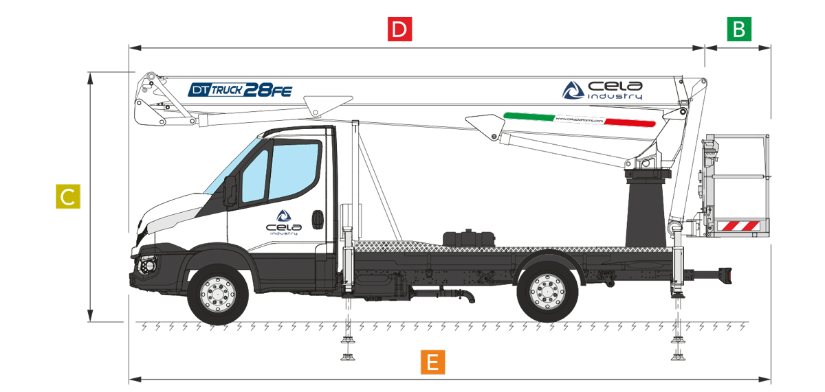 Designed to maximize operational efficiency, the DT Truck 28 FE provides exceptional flexibility for working at height. The platform is equipped with Double Telescopic (DT) technology, ensuring an expansive and nearly semicircular working area, making it easier to reach challenging points without the need to frequently reposition the vehicle.